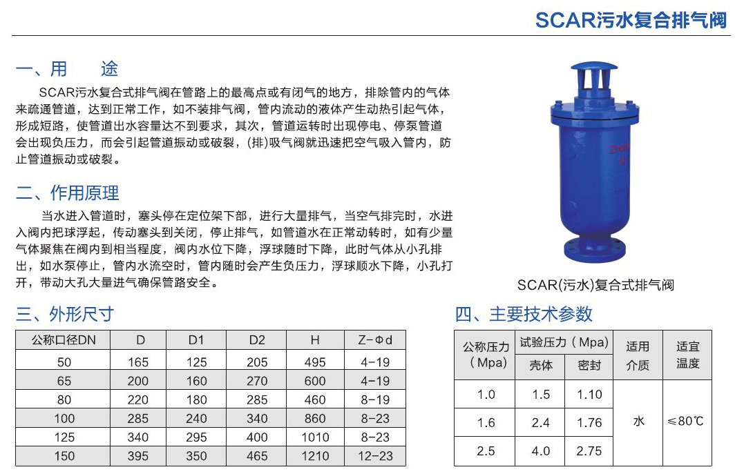 - SCAR污水復合式排氣閥在管路上的高點或有閉氣的地方,排除管內(nèi)的氣體通管道。