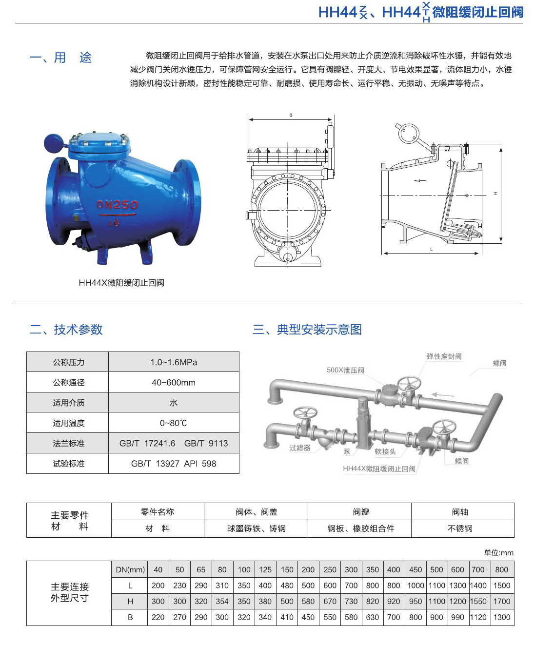 - 微阻緩閉止回閥用于給排水管道,安裝在水泵出口處用來(lái)防止介質(zhì)逆流和消除破壞性水錘,并能有效地減少閥門(mén)關(guān)閉水錘壓力,可保障管網(wǎng)安全運(yùn)行。