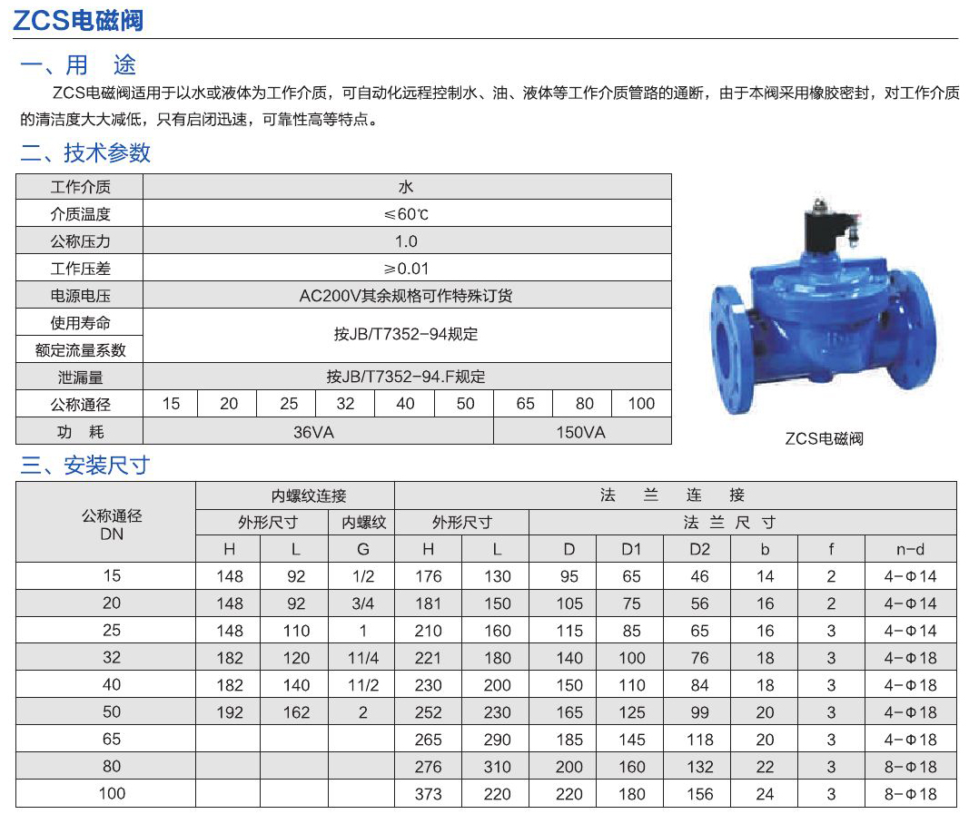 - ZCS電磁閥適用于以水或液體為工作介質(zhì),可自動化遠程控制水、油、液體等工作介質(zhì)管路的通斷,由于本閥采用橡膠密封,對工作介質(zhì)同的清潔度大大減低,只有啟閉迅速,可靠性高等特點。