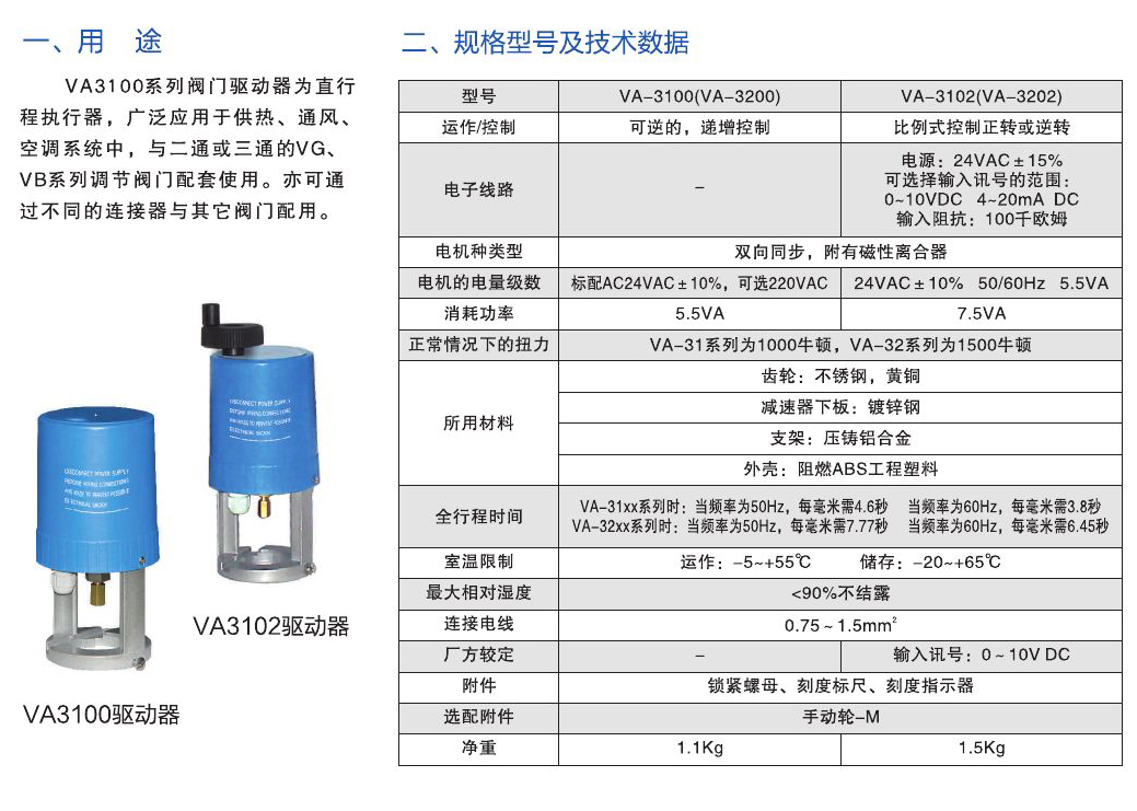 - VA3102系列閥門驅(qū)動(dòng)器為直行程掃行器,廣泛應(yīng)用于供熱、通風(fēng)、空調(diào)系統(tǒng)中,與二通或三通的VG、VB系列調(diào)節(jié)閥門配套使用。